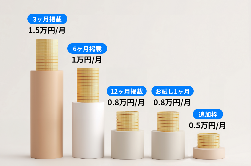 3ヵ月掲載:月額1.5万円、6ヵ月掲載:月額1万円、12か月掲載:月額0.8万円、